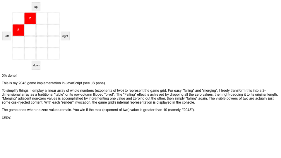See the Pen 2048 by tandaly on CodePen. For a bonus challenge try getting 2048 on this grid. Even if you dont love numbers you will love this game.
